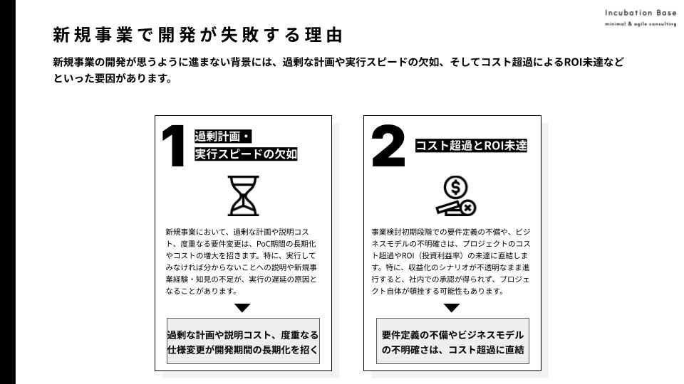 Incubation Base株式会社では、新規事業の構想段階からMVP構築・システム開発まで、実行フェーズに重点を置いた伴走型のサポートを提供しています。「アイデアはあるが、具体的な進め方がわからない」「社内にエンジニアがおらず、どう動かせばよいかわからない」というお悩みをお持ちの場合は、ぜひ一度ご相談ください。